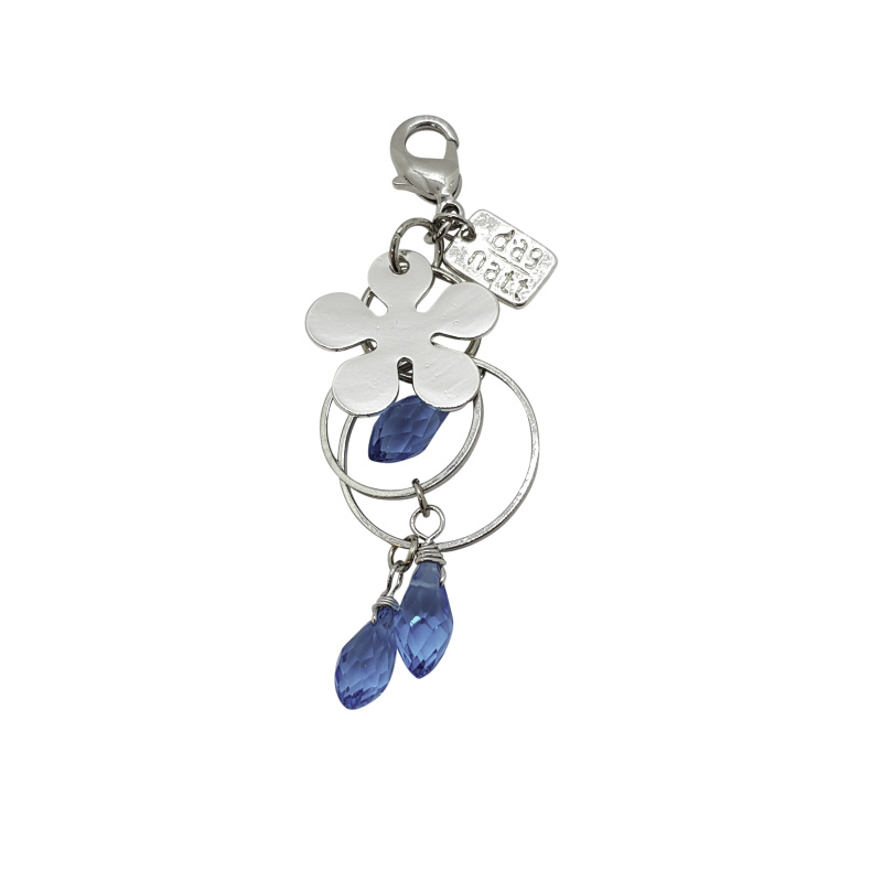 Hänge av silverfärgad metall med ringar, blomma och rosa kristaller.