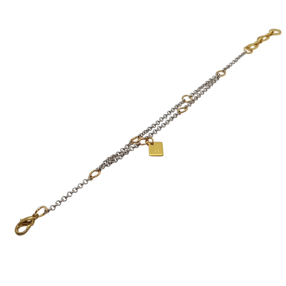 Fint armband där silverfärgad länk vävs ihop med guldpläterade öglor. 18 cm långt plus 3 cm förlängning.