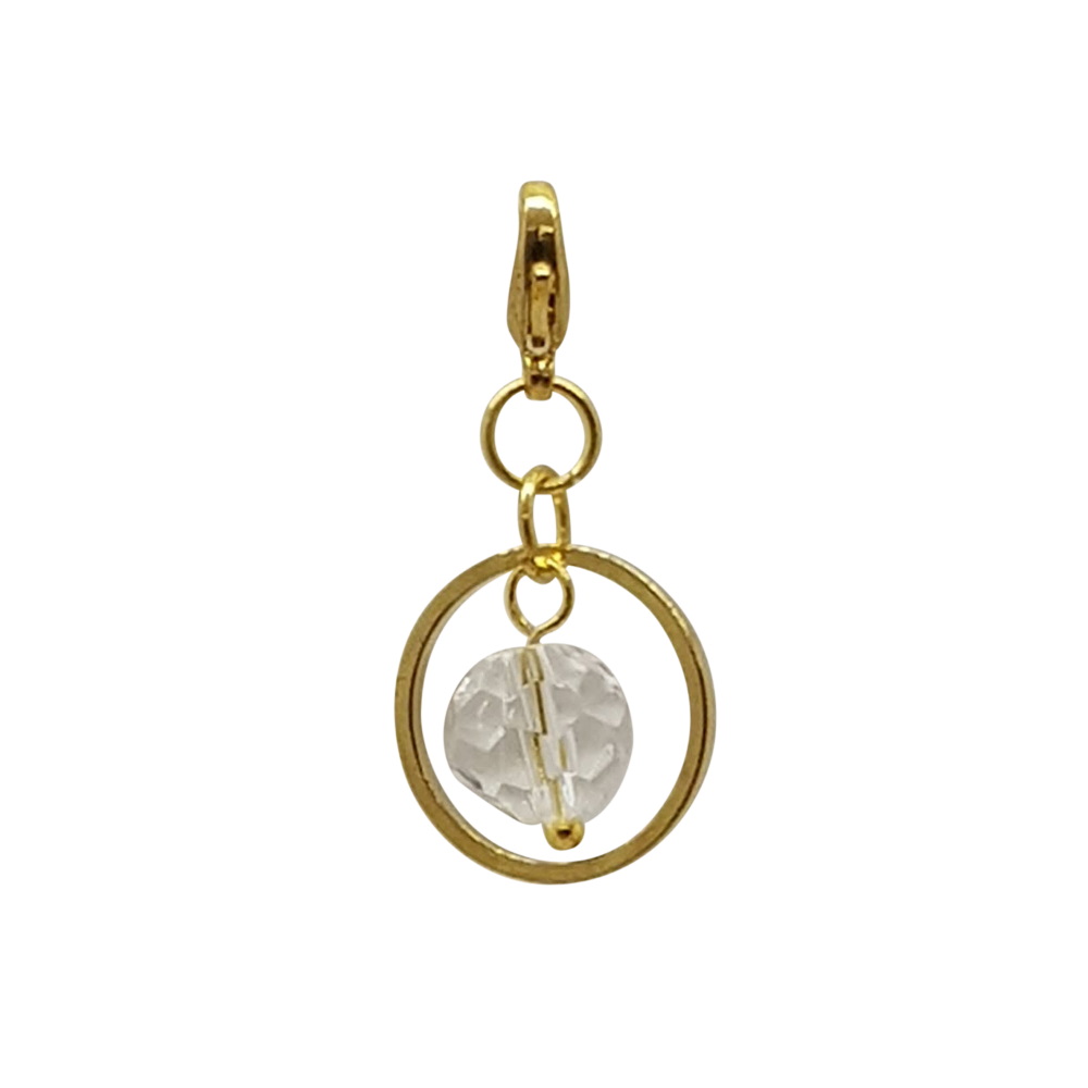 Minihänge med en rund, fasettslipad kristall i en ring. Guldpläterad, nickelfri metall, och vår minsta karbinhake. Att använda till exempel till örhängesstift eller på ett halsband.